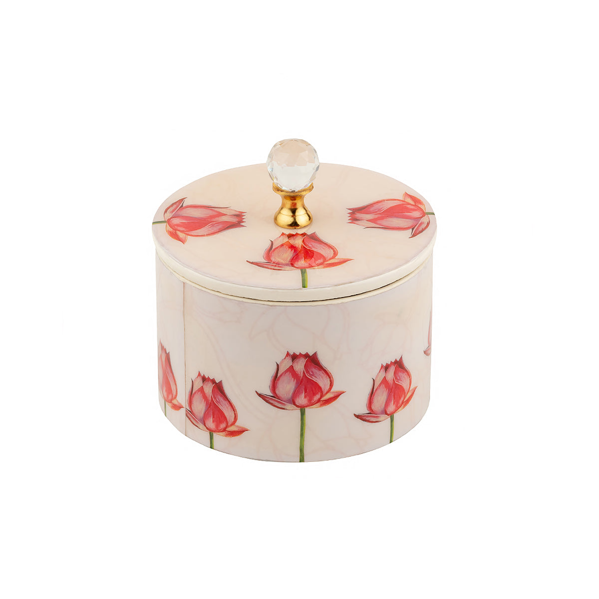 The Box with enchanting Ivory & Red tones is a Keepsake Glossy Clear Box is a beautifully crafted gift box that combines elegance and charm. Featuring a lid with a knob, making it ideal for placing a special gift, chocolates or sweets. The exterior and inner lining are finished in a high-gloss enamel.