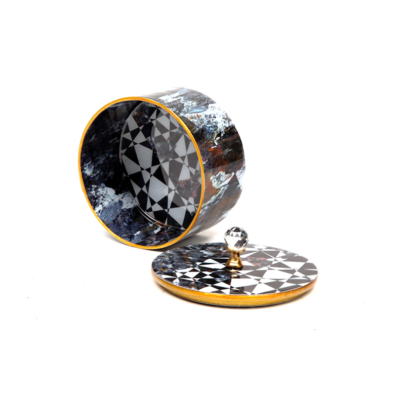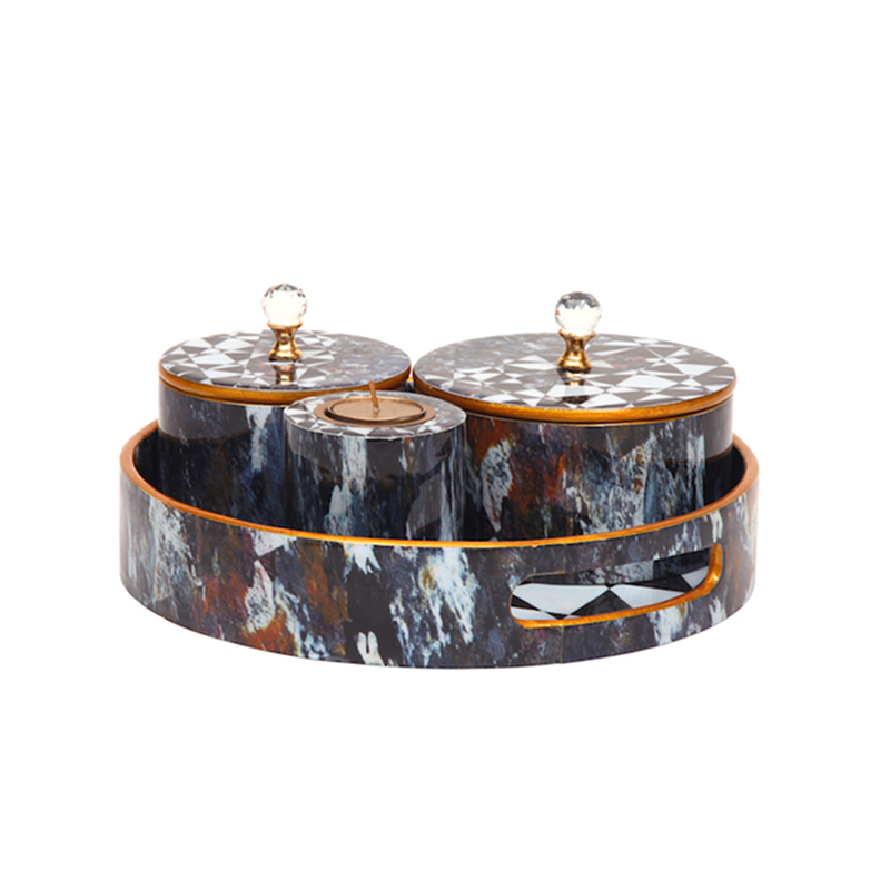 The Set includes a Sleek Round tray with 2 boxes, and a Candle Votive in Blacks, Blue & White tones beautifully crafted with elegance and charm. Making it ideal for placing a special gift, chocolates or sweets. The exterior and inner lining are finished in a high-gloss enamel.